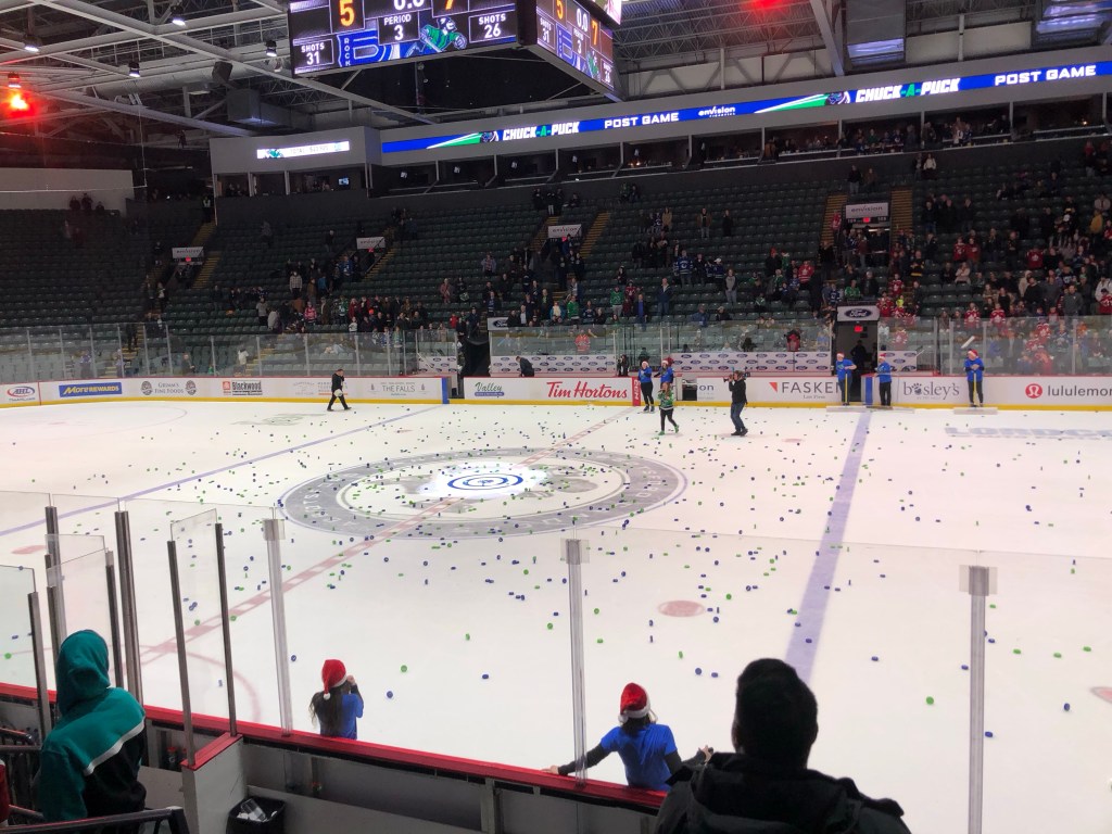Witzig war, dass nach dem ersten Tor von Abbotsford Kuscheltiere in MASSEN aufs Eis geworfen wurde. Das war eine Action hier um Stofftiere für Kinder zu sammeln, die in Familien wohnen, die nicht si viel Geld haben.