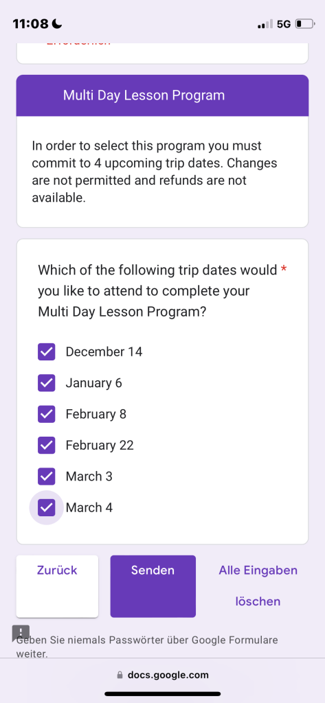 Während Lunch haben ich mich für die nächsten Ski Trips angemeldet. Das sind nur $220 für 4 Trips. Das sind einfach nur 165€!