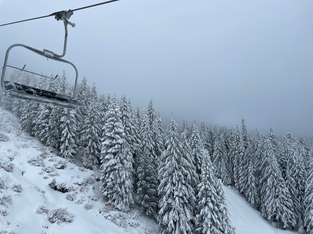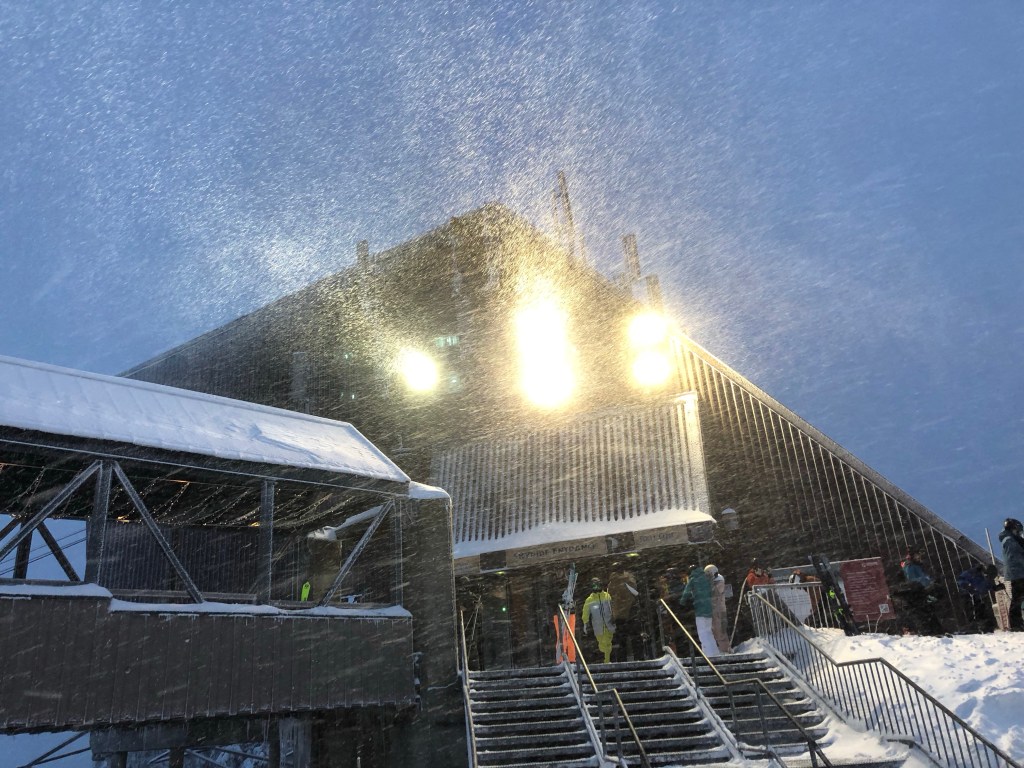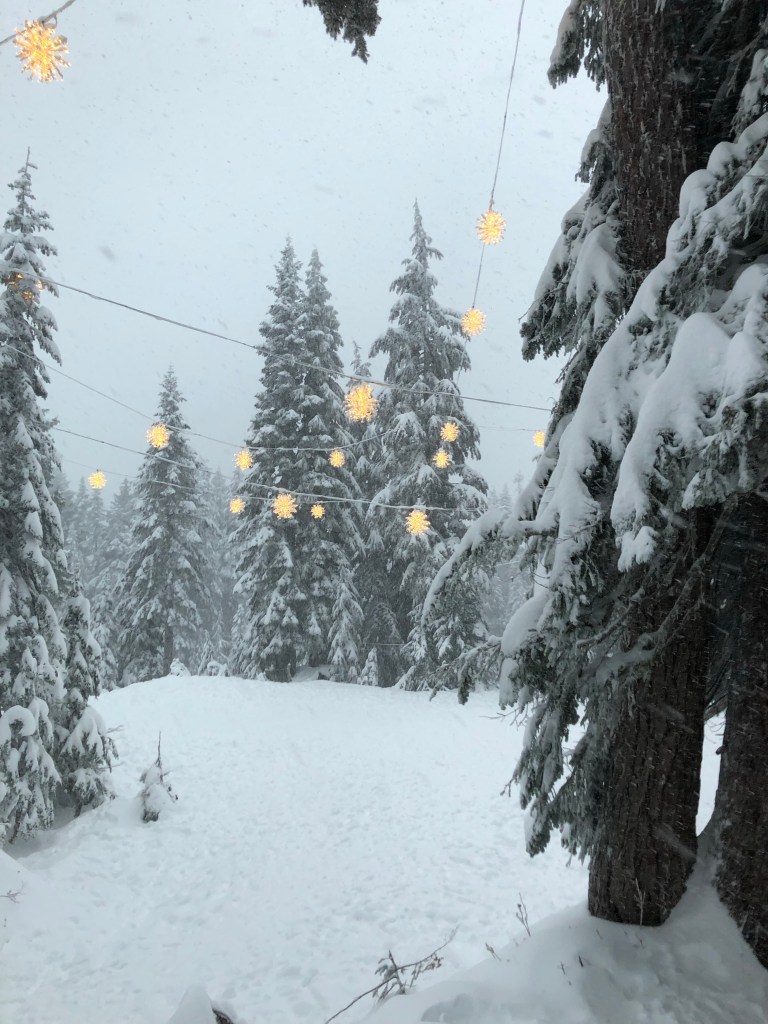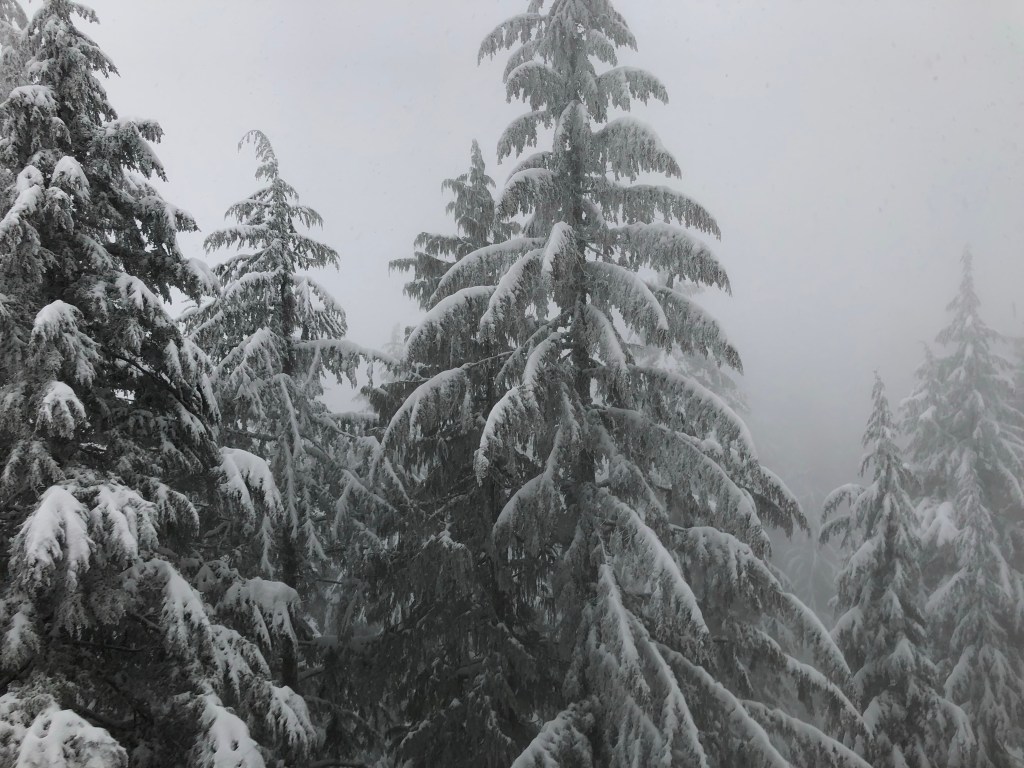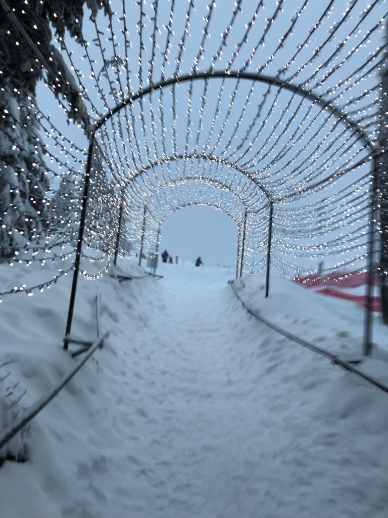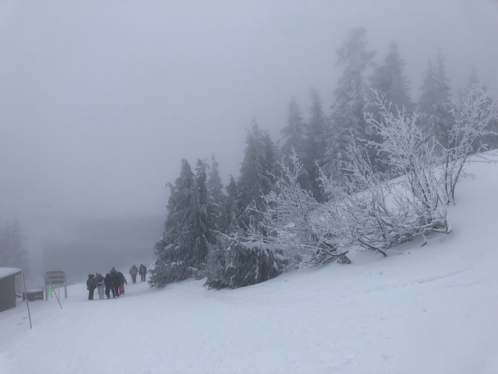 Naja…wir sind dann auf jeden Fall mit der Gondel den Berg hochgefahren und das war echt witzig. Unten war alles komplett grün und man konnte mein bisschen Schnee sehen, aber als wir dann in den Nebel eintauchten war von jetzt auf gleich ALLES weiß! Das war mega schön!