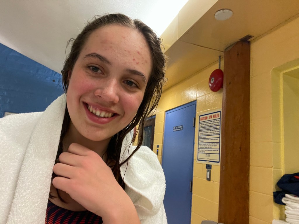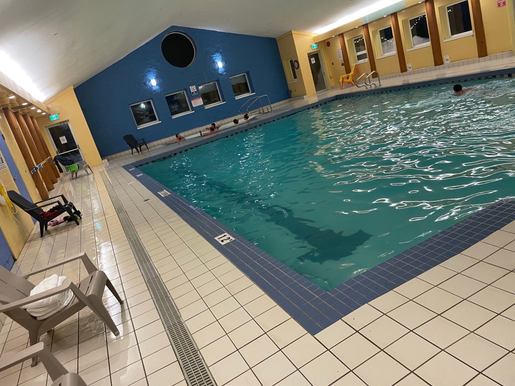 Dummerweise schlafen in einer Lodge in dem von der Anzahl an Betten so ungefähr 5 Leute reinpassen 12. Das heißt wir haben dann immer zwei Leute in den Betten schlafen lassen, haben nen Tisch zum Bett umgebaut und haben die Couch einigermaßen gemütlich gemacht, sodass einer auch auf der Couch schlafen kann. Danach haben wir dann alle ein bisschen gechillt und haben dann auch schon bald gegessen. Wir mussten unser Essen selbst mitbringen, das heißt jeder hat etwas eigenes gekocht. Ich habe Kraftdinner an diesem Abend gegessen. Danach sind wir dann alle in den Pool gegangen. Der Pool war kleiner als wir dachten, aber es war trotzdem etwas.